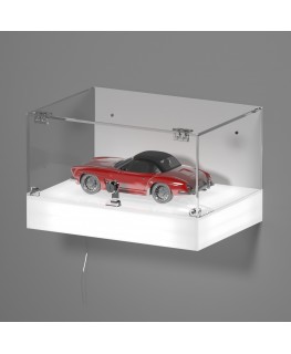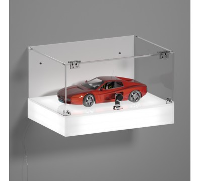 ANPASSBARE Wandvitrine mit LED-beleuchtetem Sockel und transparenter Plexiglasplatte, 5 geschlossenen Seiten und Tür mit Frontscharnieren und Schloss – Dicke 5 mm (Opale Bodenplatte – Weiße Seitenplatte)