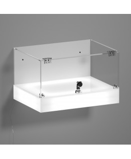 Anpassbar – Wandvitrine mit LED-beleuchtetem Opalboden und transparenter Plexiglasplatte, 5 geschlossenen Seiten und Tür mit Frontscharnieren und Schloss | weiße Seite - dick. 5 mm
