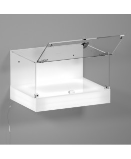 ANPASSBARE Wandvitrine aus transparentem Plexiglas mit opaler Grundplatte und weißer Seitenplatte.