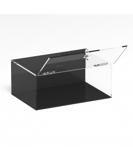 ANPASSBARE transparente Thekenvitrine aus Plexiglas mit schwarzer Grundplatte und schwarzer Seitenplatte.