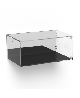 Individualisierbar – Wandmontierte Plexiglasvitrine mit Tür- und Seitenscharnieren und Magnetverschluss, schwarzer Sockel | Seitenspiegel - Dicke 5 mm