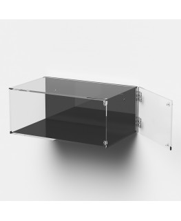 ANPASSBARE transparente Wandvitrine aus Plexiglas mit Tür mit seitlichen Scharnieren und Magnetverschluss – Dicke 5 mm (Schwarze Grundplatte – Seitenplatte verspiegelt)