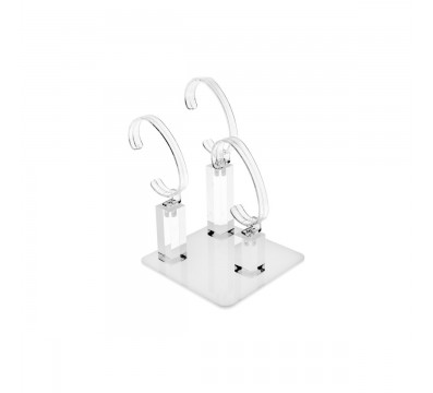 Uhrenständer aus transparentem und weißem Plexiglas mit 3 Schlitzen, ideal zum Präsentieren von Uhren in Schmuck- und Uhrengeschäften.