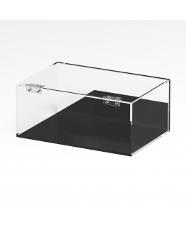 ANPASSBARE transparente Thekenvitrine aus Plexiglas, 5 geschlossene Seiten, mit scharnierbestückter Vordertür – Dicke 5 mm (Schwarze Grundplatte – Seitenplatte verspiegelt)