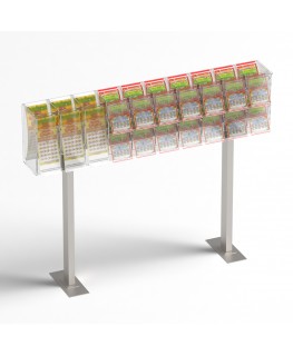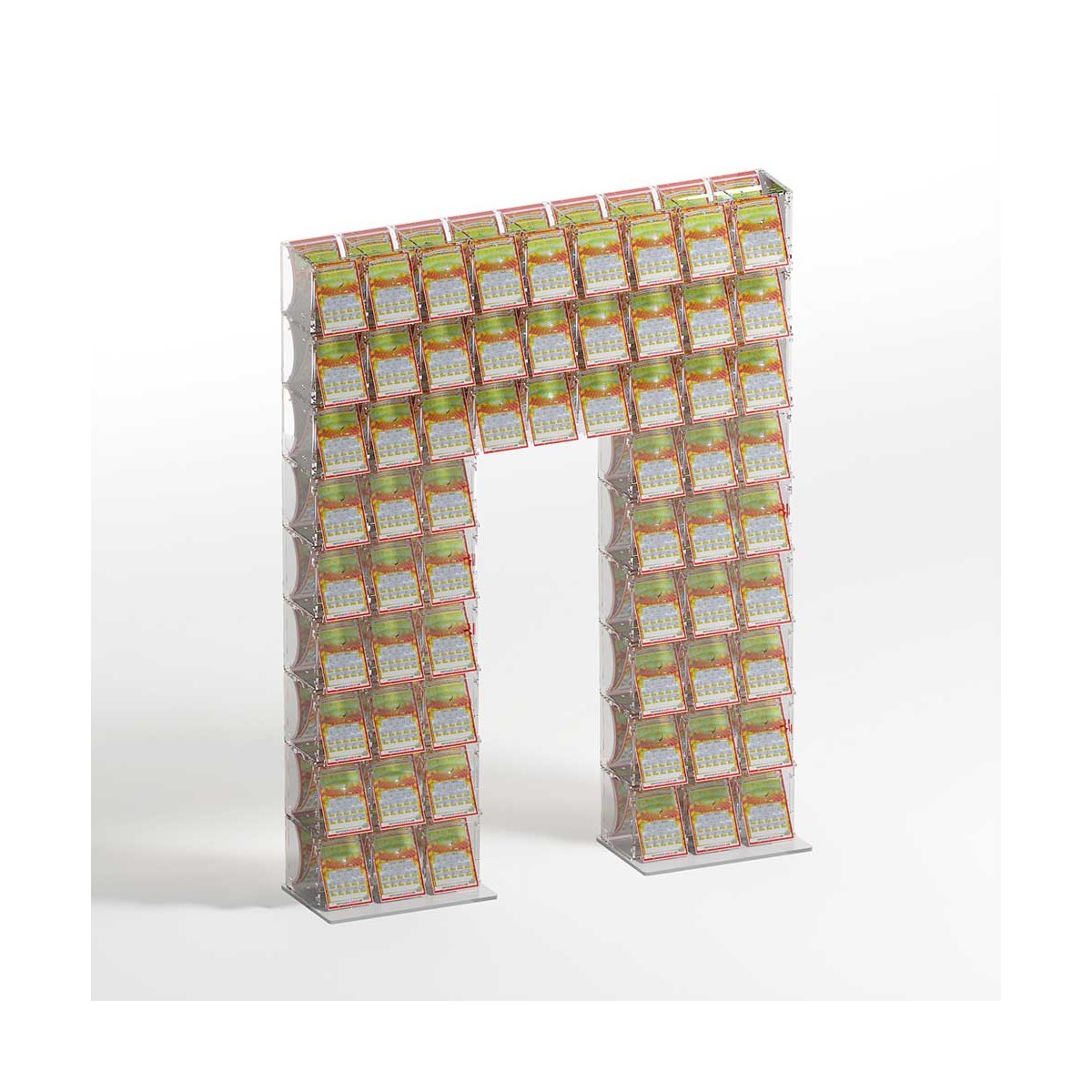 Expositor de sobremesa para tarjetas rasca y gana en plexiglás transparente con 59 compartimentos y puerta frontal en el lado del vendedor - Dimensiones: 109x17x H106 cm