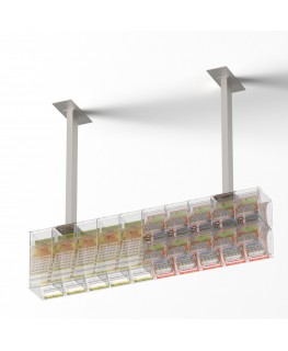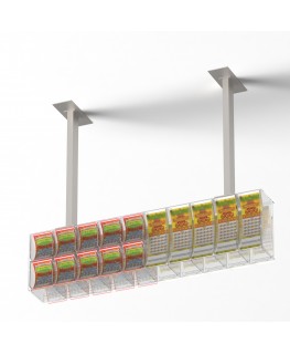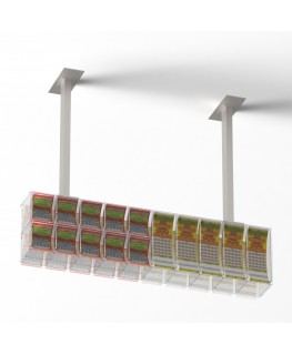 Expositor de techo para tarjetas rasca y gana en plexiglás transparente con 15 compartimentos y puerta frontal en el lado del vendedor - Dimensiones: 121x17x H30 cm