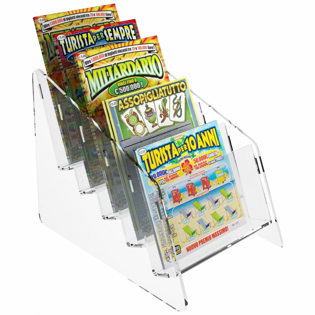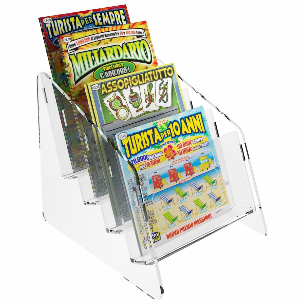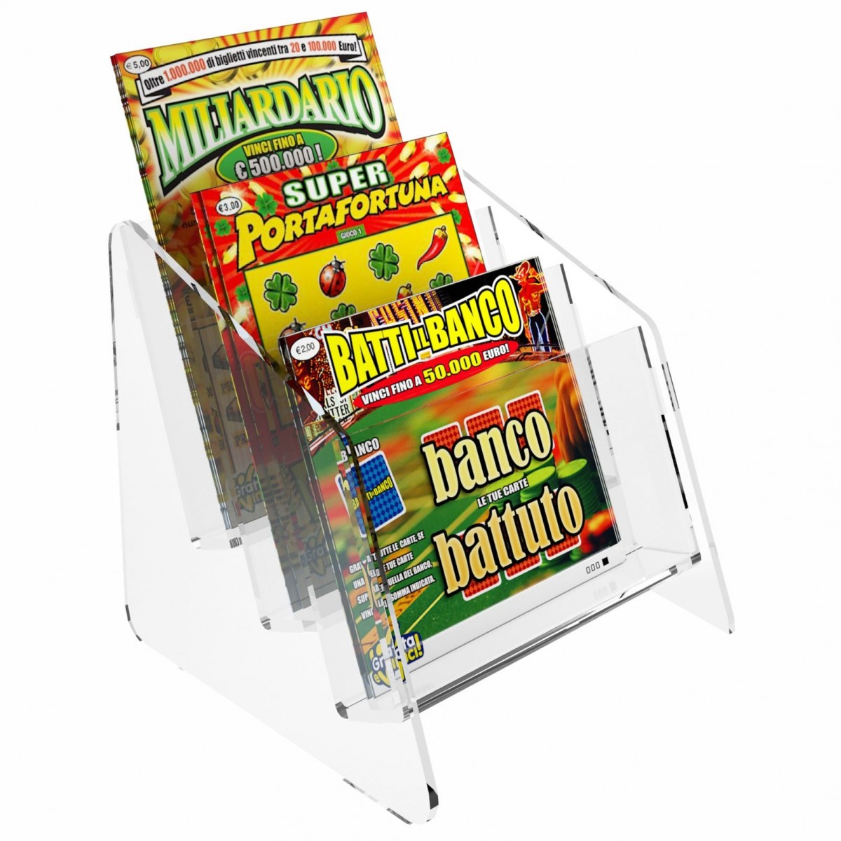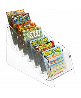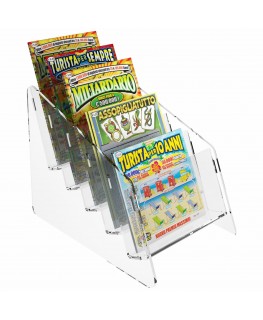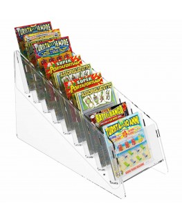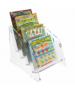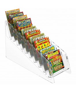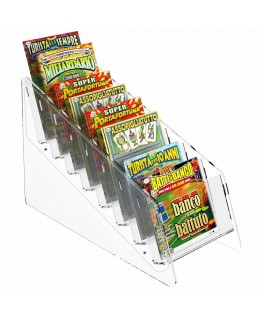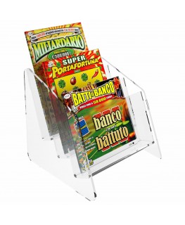 Expositor de sobremesa para tarjetas rasca y gana en plexiglás transparente, ideal para estancos, bares, etc.