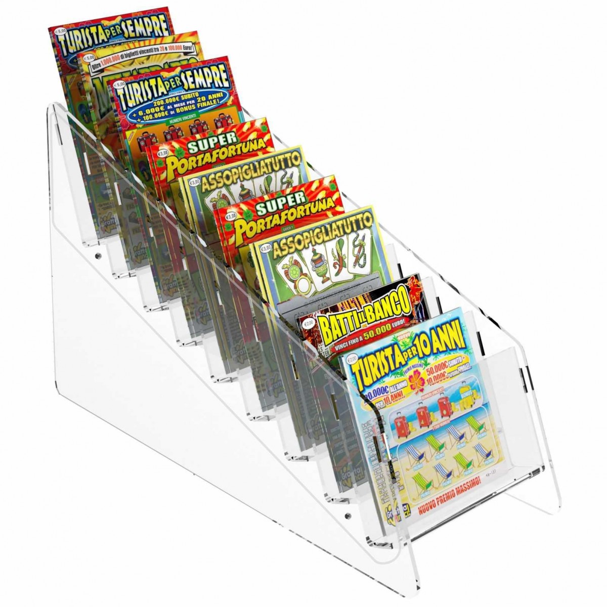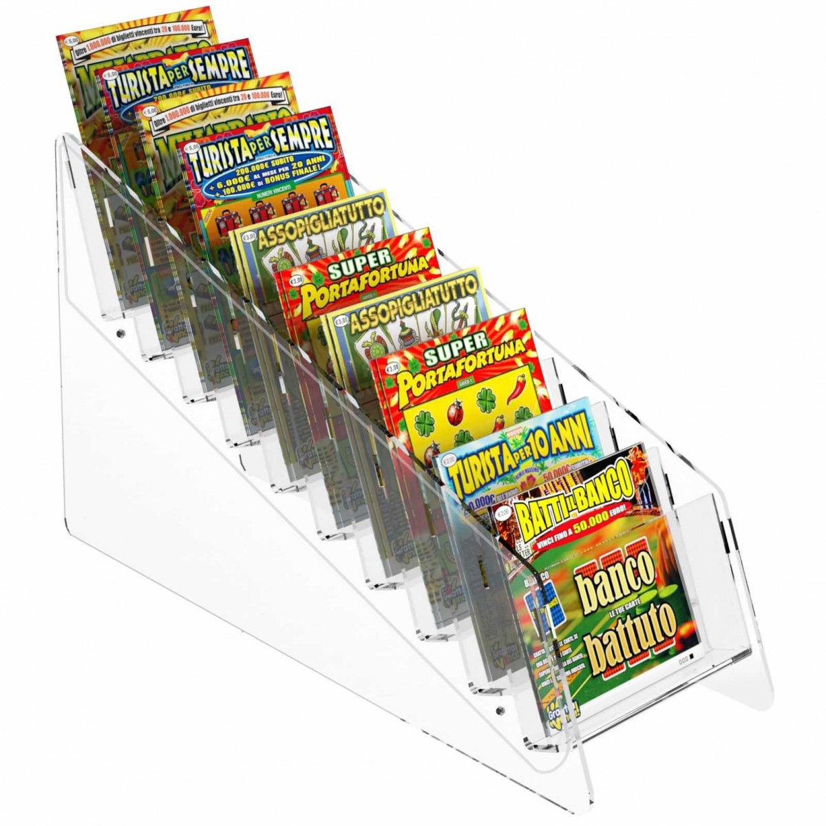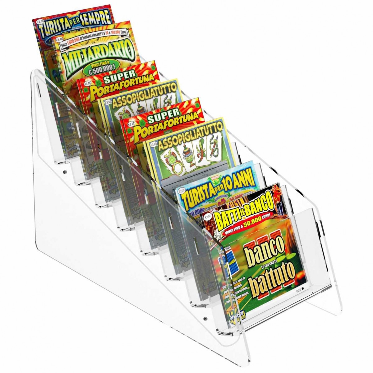 Expositor de sobremesa para tarjetas rasca y gana en plexiglás transparente, ideal para estancos, bares, etc.