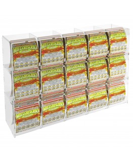 Expositor de sobremesa para tarjetas rasca y gana en plexiglás transparente con 15 contenedores SIN PUERTA