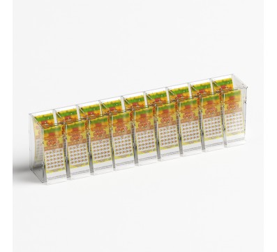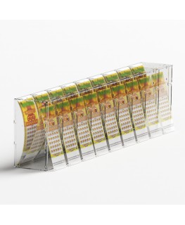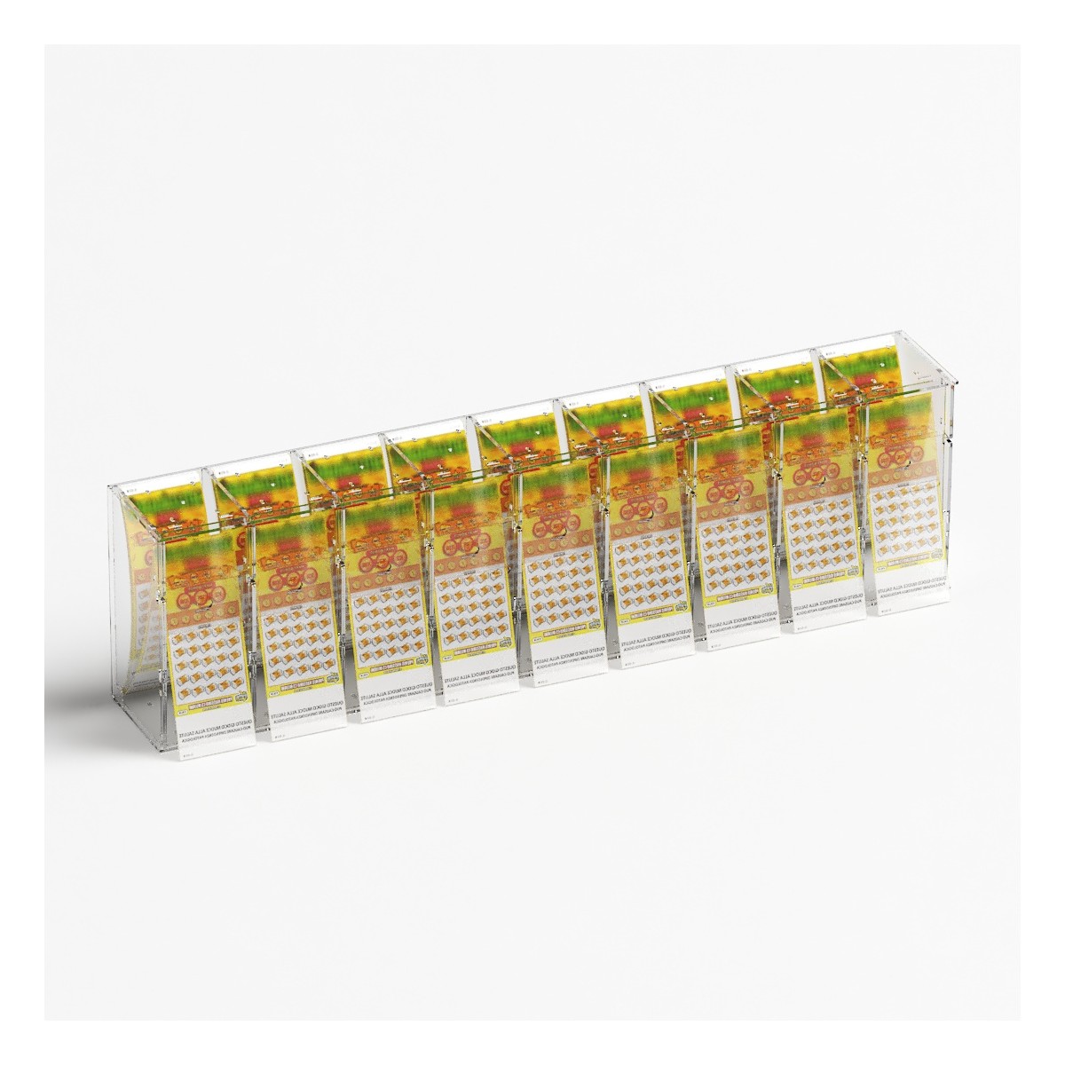 Expositor de tarjetas rasca y gana para mostrador o techo en plexiglás transparente con 9 compartimentos y puerta frontal en el lado del vendedor - Dimensiones: 109x17x H30 cm