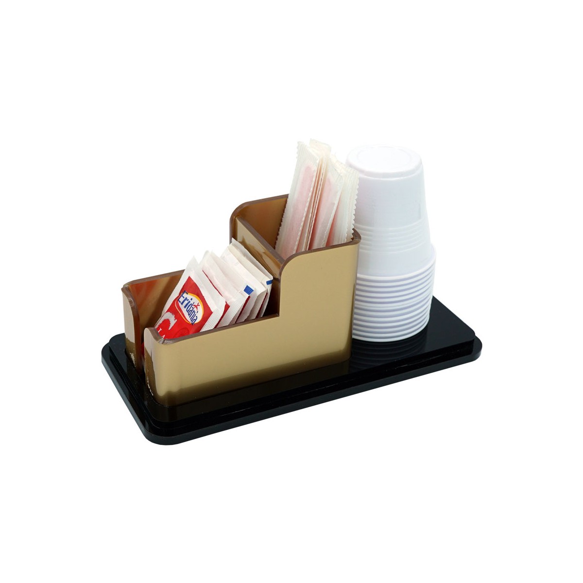 Contenedor de plexiglás negro y dorado para sobres de azúcar, removedores y vasos para mostrador o mesa con tres compartimentos.