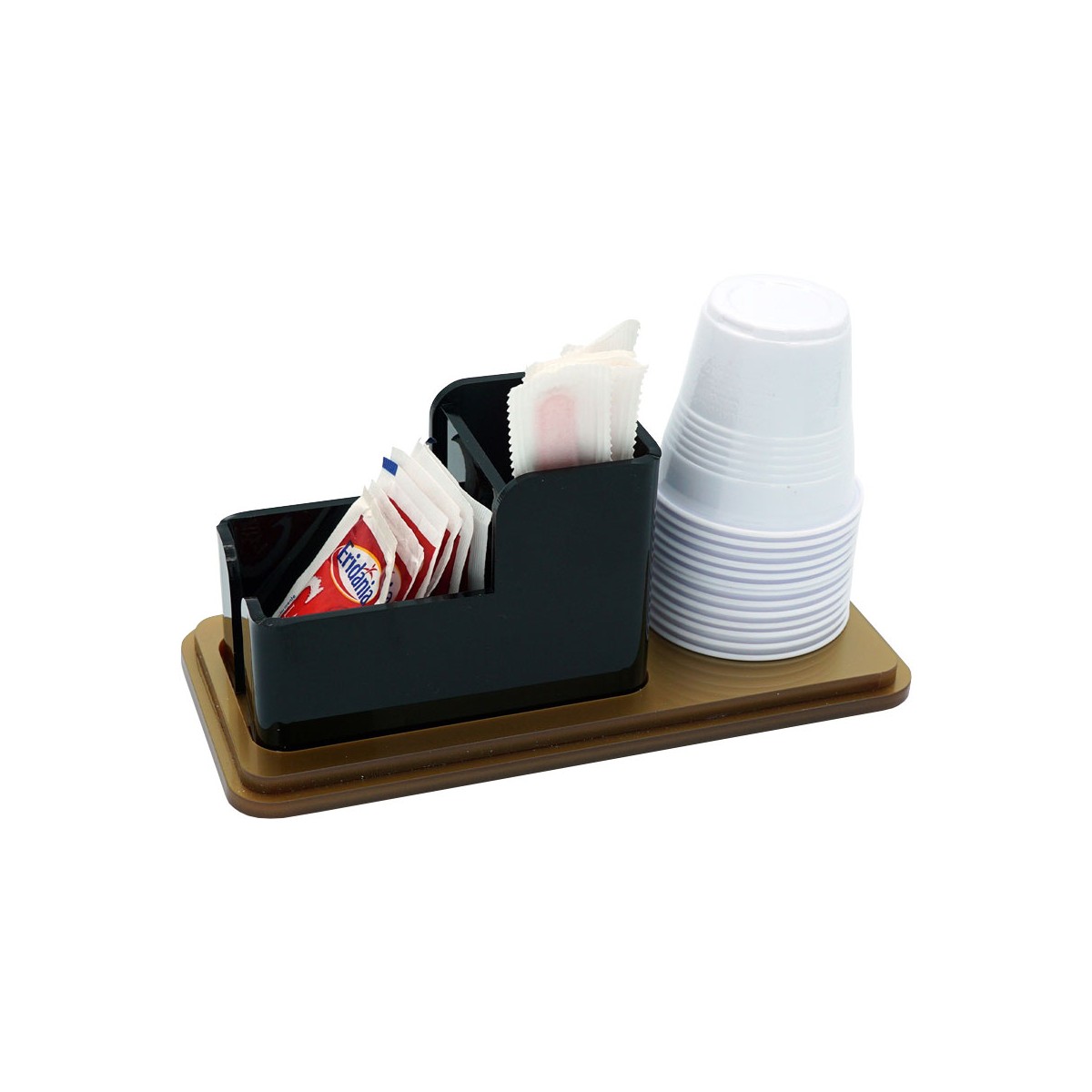 Contenedor de plexiglás dorado y negro para sobres de azúcar, removedores y vasos de mostrador o de mesa con tres compartimentos.
