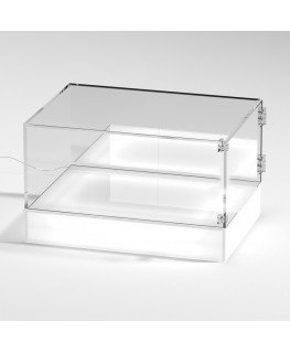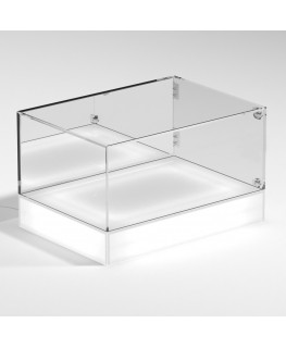 Vitrina de mostrador PERSONALIZABLE con base iluminada por LED y tapa de plexiglás transparente, 5 lados cerrados y puerta con bisagras laterales - Espesor 5 mm (Panel base opal - Panel lateral espejo)