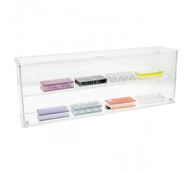 Vitrina de plexiglás transparente con 2 compartimentos y una puerta de cierre simple.