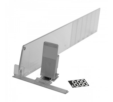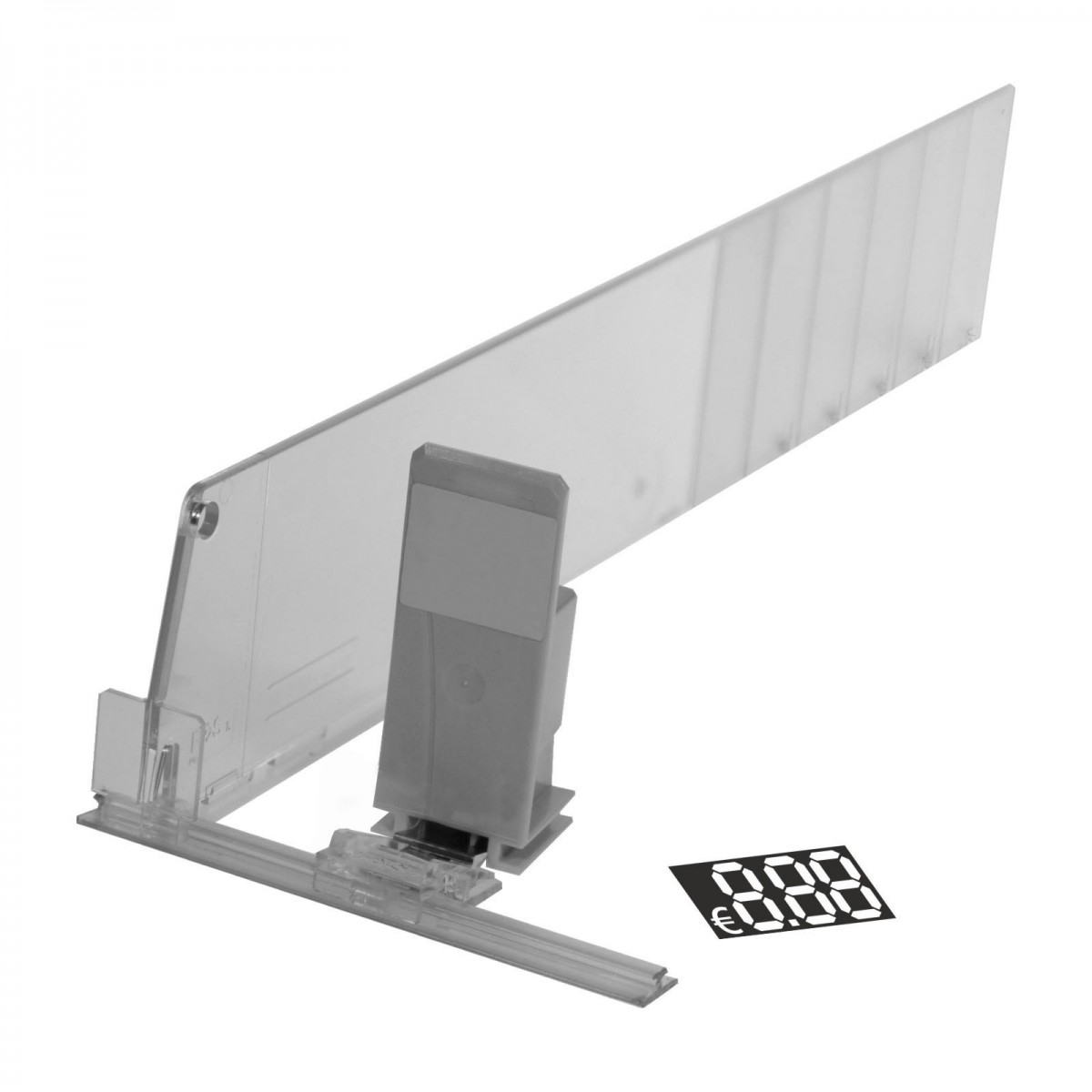 Complet avec poussoir, séparateur de 355 mm de long pouvant être réduit à 205 mm, piste adhésive double face pour la fixation et étiquette de prix double face.