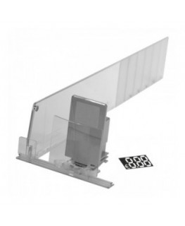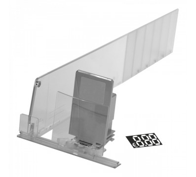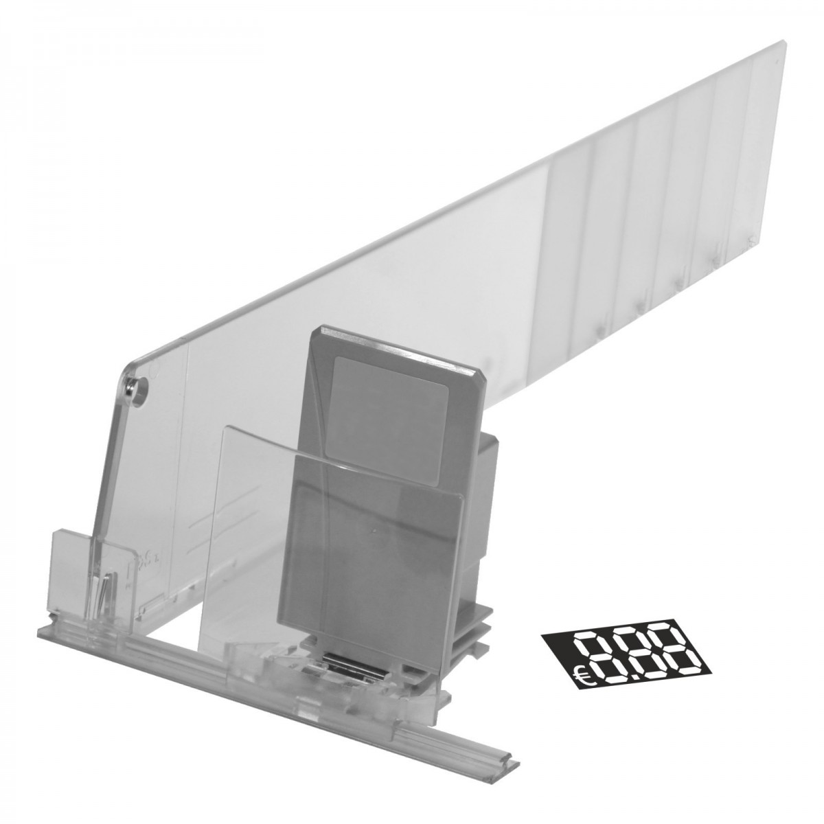 Complet avec poussoir, séparateur de 355 mm de long pouvant être réduit à 205 mm, piste adhésive double face pour la fixation et étiquette de prix double face.