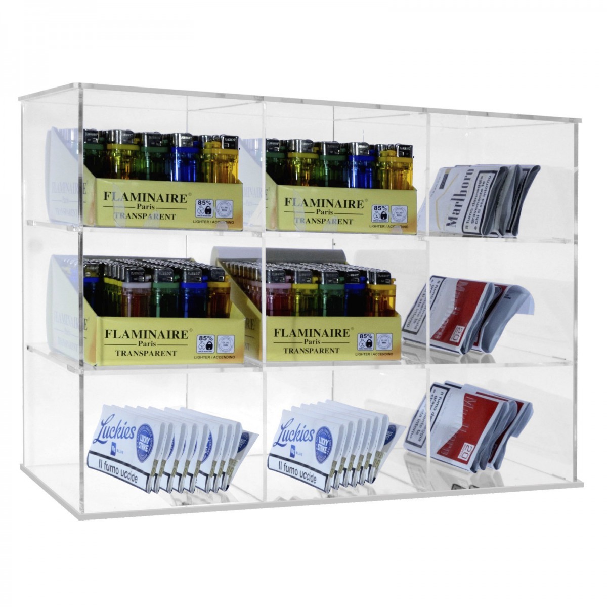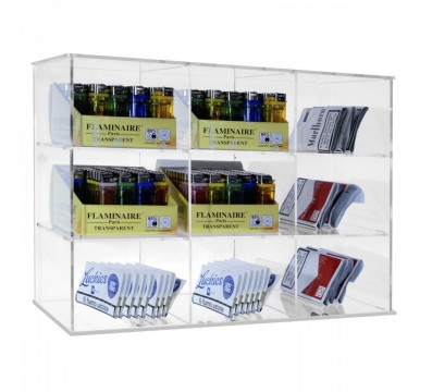 Présentoir universel en plexiglas transparent pour papiers à rouler, cigarettes, blagues à tabac et briquets, idéal pour buralistes, bars, etc.