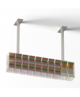 Présentoir de cartes à gratter de plafond en plexiglas transparent avec 18 bacs et porte d'entrée côté commerçant - Dimensions : 121x17x H30 cm