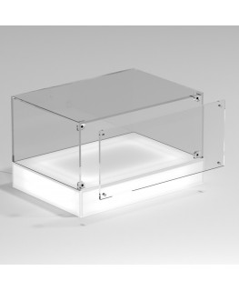 Vitrine de comptoir PERSONNALISABLE avec base éclairée par LED et plateau en plexiglas transparent, 5 côtés fermés et porte avec aimants - Épaisseur 5 mm (Panneau de base opale - Panneau latéral transparent)