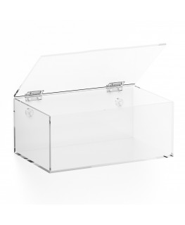 Vitrine murale en plexiglas transparent PERSONNALISABLE avec panneau de base transparent et panneau latéral transparent.