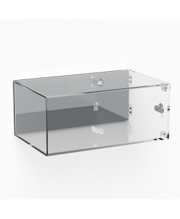 Vitrine murale en plexiglas transparent PERSONNALISABLE avec porte à charnières latérales et serrure - Épaisseur 5 mm (Panneau de base transparent - Panneau latéral miroir)