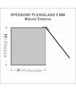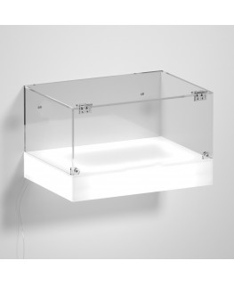 Vitrine murale PERSONNALISABLE avec base éclairée par LED et partie supérieure en plexiglas transparent, 5 côtés fermés et porte avec charnières frontales - Épaisseur 5 mm (Panneau de base opale - Panneau latéral transparent)