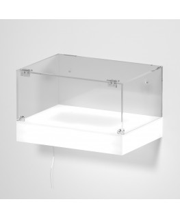 Personnalisable - Vitrine murale avec base opale éclairée par LED et plateau en plexiglas transparent, 5 côtés fermés et porte avec charnières frontales | côté transparent - épais. 5 mm