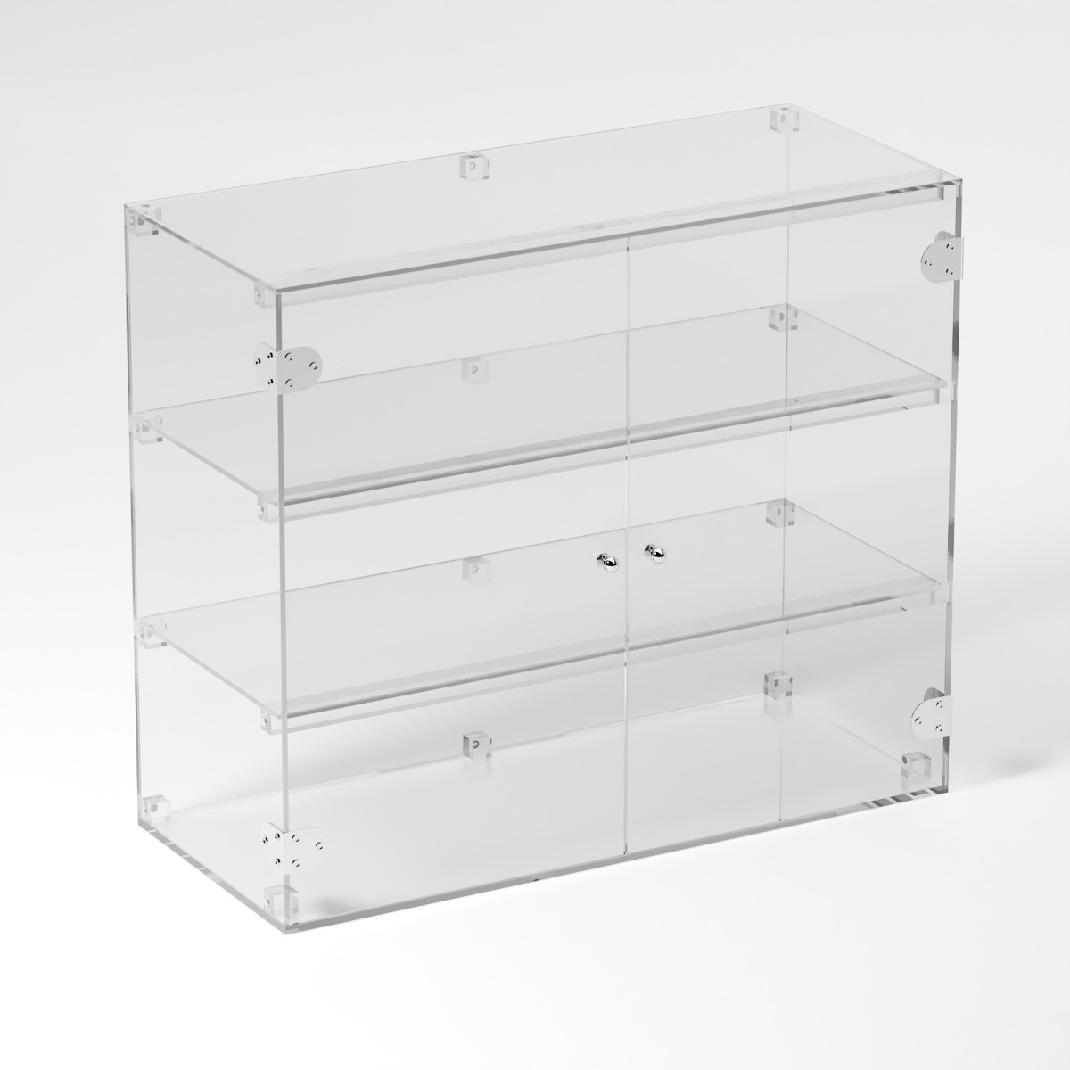 Grande vitrine en plexiglas transparent avec 3 étagères transparentes adaptées à l'exposition de divers articles.