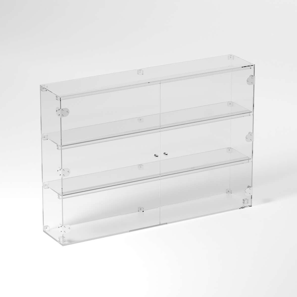Grande vitrine en plexiglas transparent avec 3 étagères transparentes adaptées à l'exposition de divers articles.