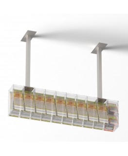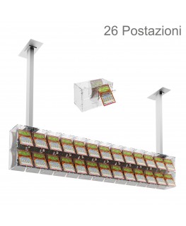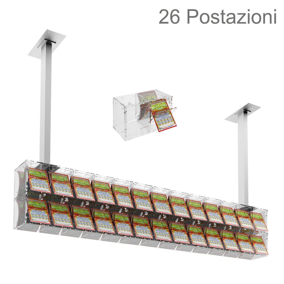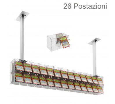 Ceiling-mounted scratch card display in transparent plexiglass with 26 containers equipped with a front door on the retailer side, easy to open and close to protect the scratch cards.