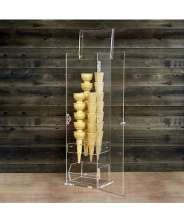 Transparent plexiglass ice cream cone holder with spoon holder tray and door - Dimensions: 16 x 13 x H61 cm