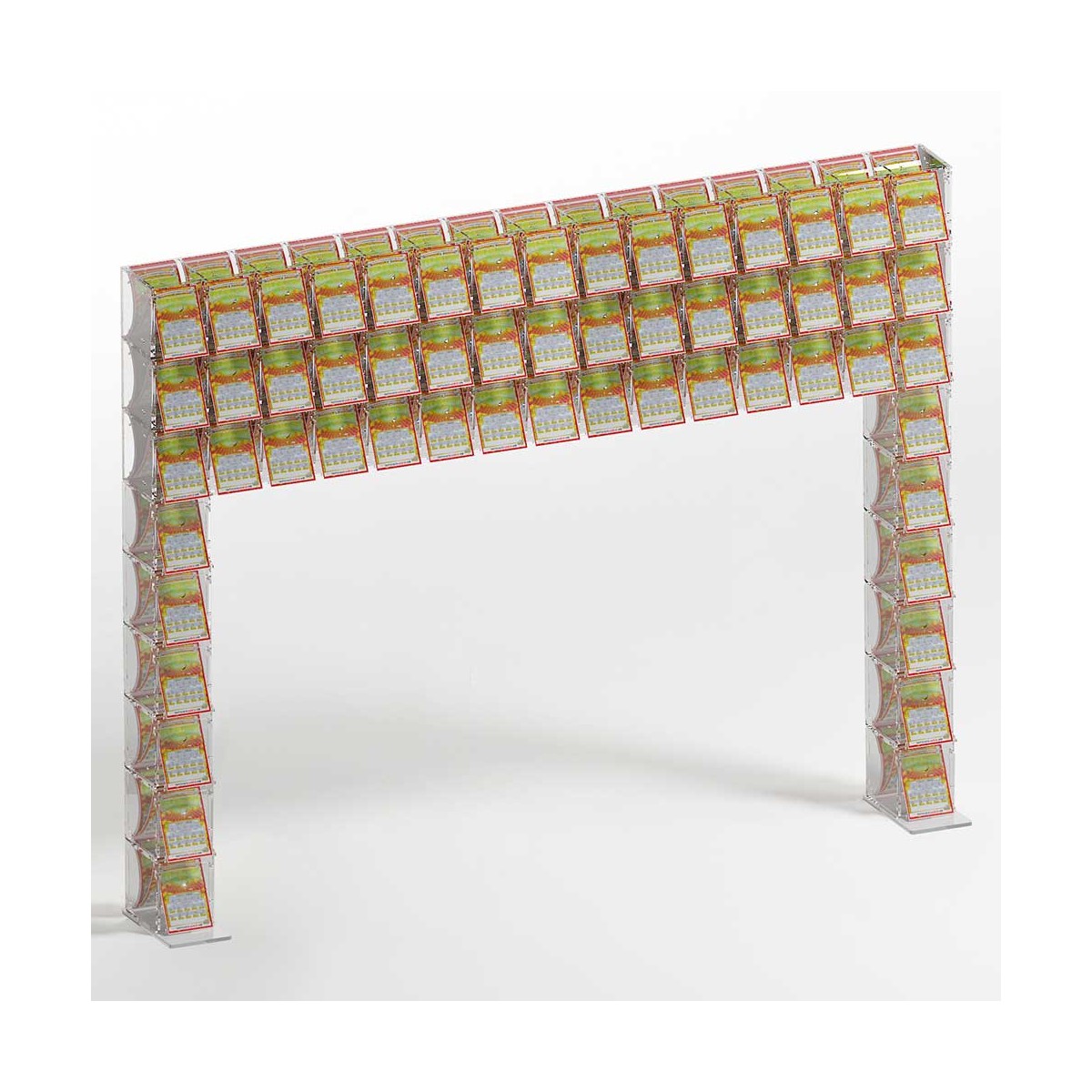 Countertop scratch card display in transparent plexiglass with 57 containers and front door on the retailer side - Dimensions: 180x17x H136 cm