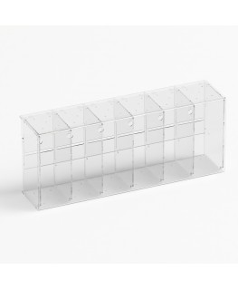 Counter or ceiling scratch card display in transparent plexiglass with 6 containers with front door on the retailer side - Dimensions: 73x17x H30 cm