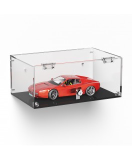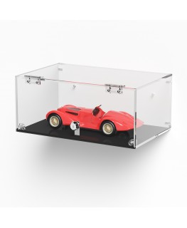 CUSTOMIZABLE transparent plexiglass wall display case with black base panel and transparent side panel.