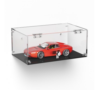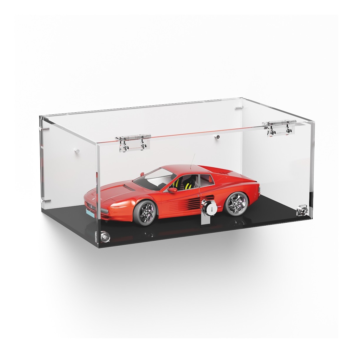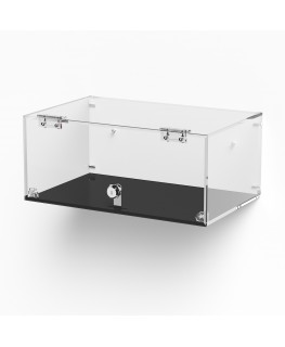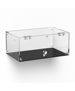 CUSTOMIZABLE Transparent plexiglass wall display case with front hinged door and lock - Thickness 5 mm (Black base panel - Transparent side panel)