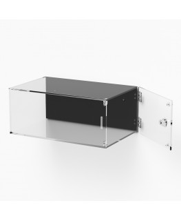 CUSTOMIZABLE Transparent plexiglass wall display case with door with side hinges and lock - Thickness 5 mm (Transparent base panel - Black side panel)