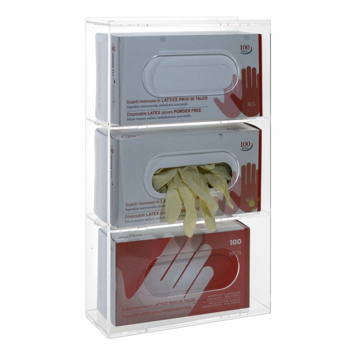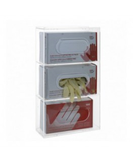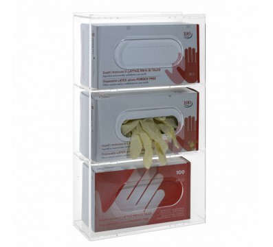 Transparent plexiglass glove dispenser with 3 compartments, ideal for hospitals, private clinics, hotels, restaurants, offices, commercial premises.